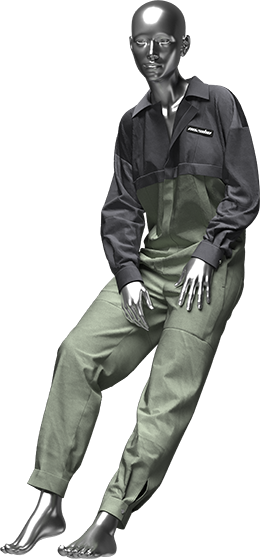 Комбинезон свободной посадки с декоративными швами, застежкой на молнии, резинкой на спинке. Рукава и низ брюк застегиваются на кнопки. В изделии использованы два цвета одного материала. Материал изделия- износостойкая смесовая ткань средней плотности.